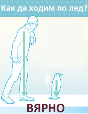 Пингвините ходят като прехвърлят тежестта от телата си върху предния крак. По този начин животинките нямат проблем с леда. Ако и ние правим същото ще сме по-стабилни върху ледената повърхност.