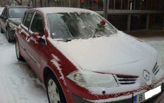 Романтичен мъж реши да изненада нежната си половинка като остави червена роза на заснеженото стъкло на автомобила й.