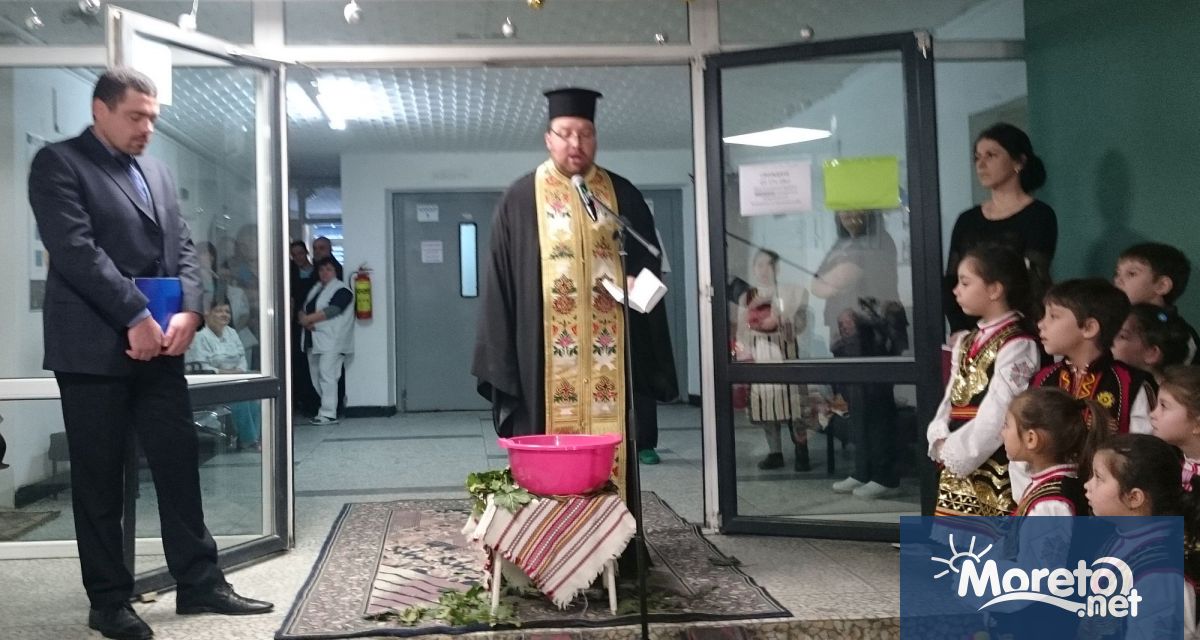 Отец Ясен освети водата, с която се изпълнява обичаят за поливане на ръце. В него участваха завеждащият родилното отделение на болницата д-р Добрин Николов и 10-годишната Кристияна.