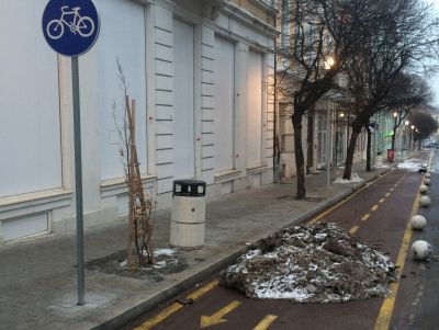 От купчините струпан сняг по част от велоалеите в центъра на града се жалва читател на Moreto.net в писмо до редакционната ни поща.