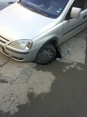 Според жената инцидентът е станал на улица "Бдин" 21. Читателката прати и снимки от инцидента, на които се вижда, как едната гума на возилото е хлътнала в асфалта.