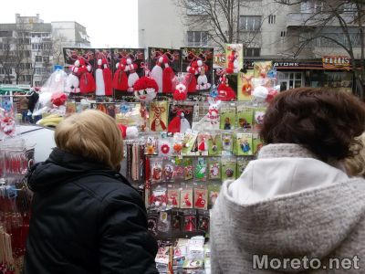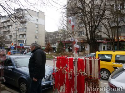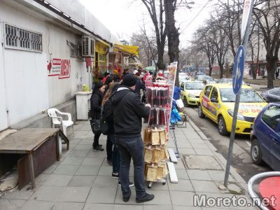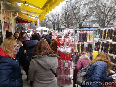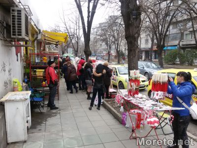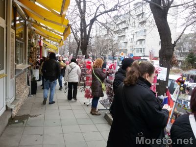 Ден преди 1 март, преминаването по тротоара от страната на пазарчето на „Чаталджа“ е почти невъзможно. Сергиите и стълпотворението от хора, спиращи се да оглеждат почти са препречили пътя към пешеходната пътека с улица „Марин Дринов“, видя репортер на Moreto.net.