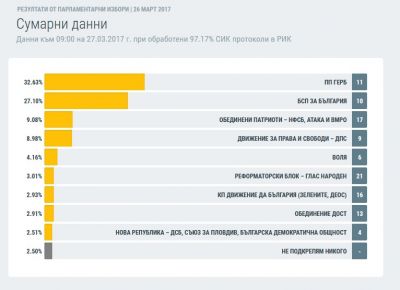 При 97.7 % обработени протоколи: ГЕРБ - 32.63 %, БСП - 27.10%