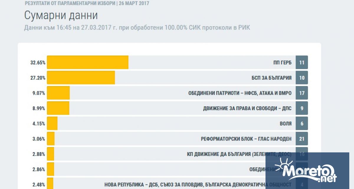 При 100 % обработени протоколи: ГЕРБ - 32.65 %, БСП - 27.20 %