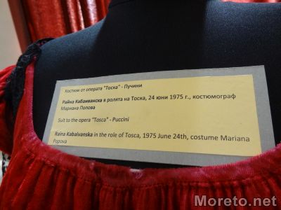 Сред експонатите са роклята, с която Райна Кабаиванска изиграва Тоска на 24 юни 1975 година във Варна, дрехата от превъплъщението на Гена Димитрова като принцеса Турандот през 1994 година, както и костюмът на Стоян Попов като Барон Скарпия от 30 юни 1993 година, предаде репортер на Moreto.net.