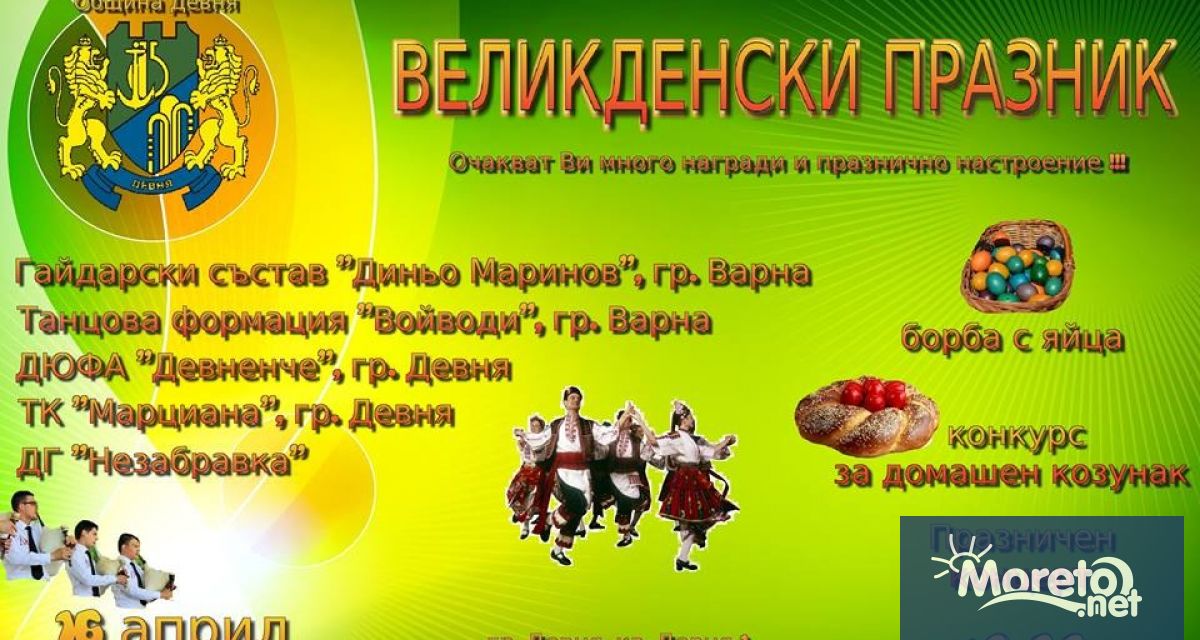 Много настроение и приятни изненади е подготвила Община Девня за своите жители и гости за Великден. На площада пред читалище "Просвета" ще се проведе голяма великденска веселба с участието на девненски и варненски фолклорни състави, научи Moreto.net.