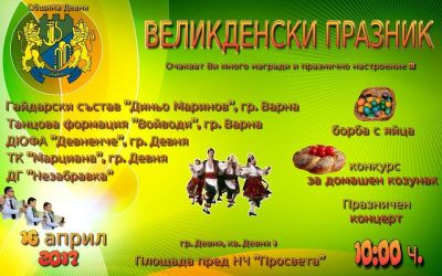 Веднага след това на площада пред читалище "Просвета" ще започне празничен концерт с участието на гайдарски състав "Диньо Маринов" - град Варна, танцова формация "Войводи" - град Варна, детско-юношеския фолклорен ансамбъл "Девненче", танцов клуб "Марциана" - Девня и малките таланти от детска градина "Незабравка". Накрая всички ще се хванат на голямо великденско хоро, което ще изпълни целия площад.