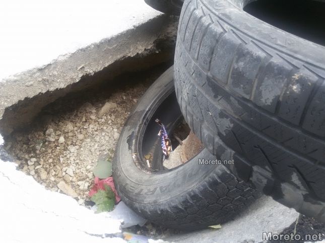 Хора от района са обозначили мястото с подръчни средства. Върху дупката са поставени стари автомобилни гуми и дори касетка за плодове и зеленчуци, за да може шофьорите да я виждат отдалече и да не се случват инциденти.