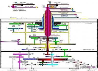 Той е побирал в дървена кутия с приблизителни размери 34х18х9 см. Вътре се помества сложна схема от няколко модула, изградени на принципа на механиката от 40 различни по размер и форма зъбчати колела. Задвижването им става, като се задават стойности и в края на цикъла от задвижвания на своеобразния циферблат се появяват стойности за Слънчевата система. Поразително точни и днес.