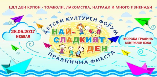 Поредното осмо издание на най-мащабния за Варна културен форум за деца и младежи - „Най-сладкият ден“ ще се проведе на 28 май /неделя/, от 10 ч. до 20 ч., а мястото е централния вход на Морската градина /пред Слънчевия часовник/.