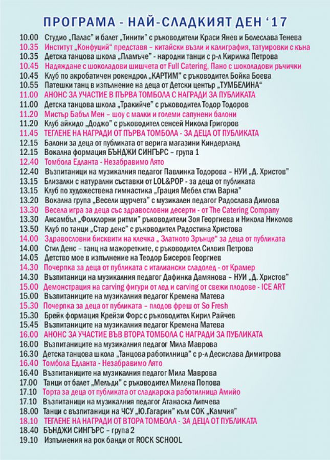 От сутринта до вечерта под открито небе над 1200 младежи и деца от варненските читалища, певчески и танцови клубове, арт школи и училища ще пеят, танцуват и рисуват, а многобройната публика ще се радва на шоколадови изненади, торти, сладоледи и други сладки изкушения, спечелени в провеждащите се през целия ден забавни състезания, игри и томболи.