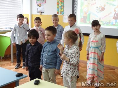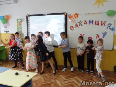 Голямата изненада в края на днешното празненство обаче се оказа тортата-слънце, специално изработена за децата. Да ги поздравят бяха дошли и хлапетата от подготвителната група на школото, част от които наесен също ще са в първи клас.