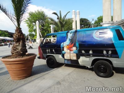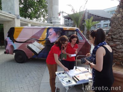 Изрисуваният с графити на Nasimo хипарски бус Volkswagen Transporter беше паркиран точно до Входа на Морската градина. Това бе и първата спирка от турнето на пътуващата книжарница, която се очаква да посети 40 населени места у нас.
