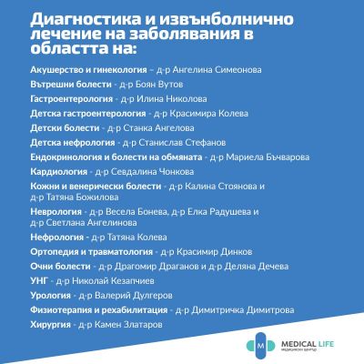 Информация за лекарите и приемно време в „Медикал Лайф“ е публикувана в сайта на медицинския център www.medicallife.bg