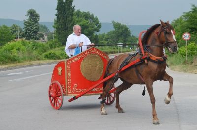 Атрактивната колесница е дело на девненския дърводелец Георги Георгиев, който е успял да я направи само за две седмици. Тя се тегли от един кон, а габаритите й са близки до бойните двуколки, разказа майсторът. Изработена е по модел на римска колесница в интернет, като в консултациите се е включил и директорът на Музея на мозайките Иван Сутев.