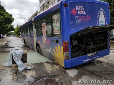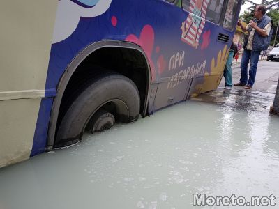 Автобус на „Градски транспорт“ пропадна в дупка на ул. „Ген. Колев“ тази сутрин. В дълбокия пътен трап е попаднала задната лява гума на превозното средство. От ръководството на общинския превозвач съобщиха за Moreto.net, че при инцидента няма пострадали хора.