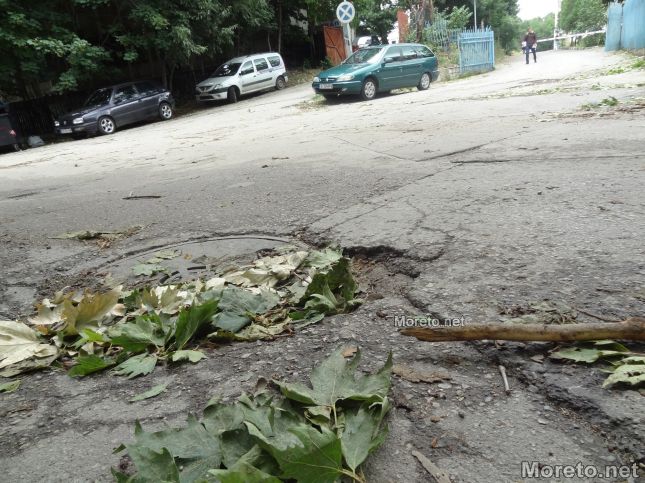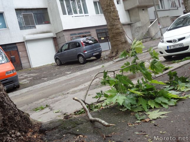 Като спомен от бурята снощи по тротоарите и пътните платна в карето между представителните булеварди "Княз Борис I" и "Осми Приморски полк" продължават да стоят множество изпочупени клони и листа на дървета.