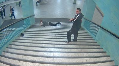 Нападението е извършено около два през нощта на 11 юни на метростанция "Alexanderplatz" в германската столица. На кадрите се вижда как 38-годишен мъж пада по стълбите, след като е ударен в главата от друг мъж.