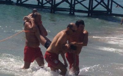 Демонстрация по водно спасяване в комплекса "Слънчев ден" приключи неочаквано с реален тест за уменията на участниците. Малко след финала на зрелищната операция, която прикова погледа на плажуващите, водните гардове Румен Йорданов и Владимир Панев извадиха от морето двама давещи се.