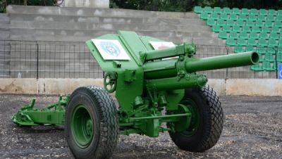122-милиметрова гаубица е поставена на входа на тунела към съблекалните на стадион "Тича" във Варна, видя репортер на Moreto.net.