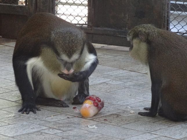 Маймуните във Варненския зоопарк са намерили човешки метод за спасение от жегите - като хапват сладолед, научи Moreto.net.