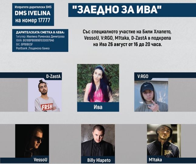 Необходимата сума за лечението й е 65 хил. евро. До момента са събрани близо 60 хил. лева. Ивелина се нуждае от още 70 хил. лева, за да замине за Кипър, където ще и направят операция на гръбначния стълб, присаждане на стволови клетки и ще и поставят титаниеви импланти, за да успее отново да проходи.