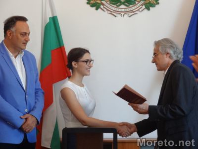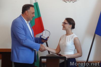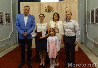 Почетното отличие на МОН „Национална диплома“ получи възпитаничката на Математическа гимназия „Д-р Петър Берон“ Дарена Славова. Признанието се присъжда на младата дама заради постиженията й по време на целия етап на гимназиално обучение. Успехът и за всичките пет години в МГ е пълен отличен. Освен това има шестици на матурите по български, математика и английски. Тя е единствена в града с подобно постижение. Дарена е лауреат на Националната олимпиада по литература. По време на обучението си тя постига и редица други отличие в извънкласните занимания, предаде репортер на Moreto.net.