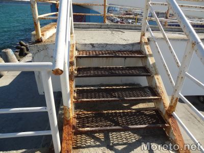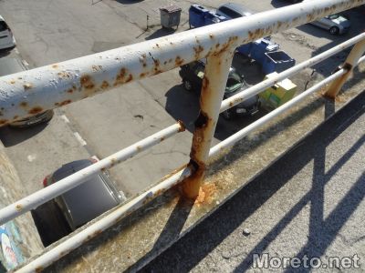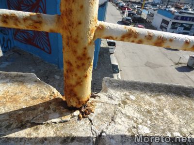 Разядени и разпадащи се, част от парапетите на пасарелката, водеща от Морска гара към Вълнолома във Варна, могат всеки момент да се стоварят върху главите на преминаващите отдолу пешеходци. На места масивните метални тръби са толкова разядени от ръждата, че буквално се крепят на магия, метри над автомобилния паркинг, видя репортер на Moreto.net.