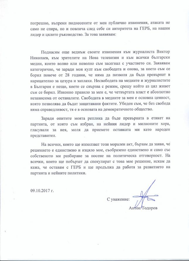 "Заради опитите репликата ми да бъде превърната в етикет на партията, приемете оставката ми", пише Тодоров.