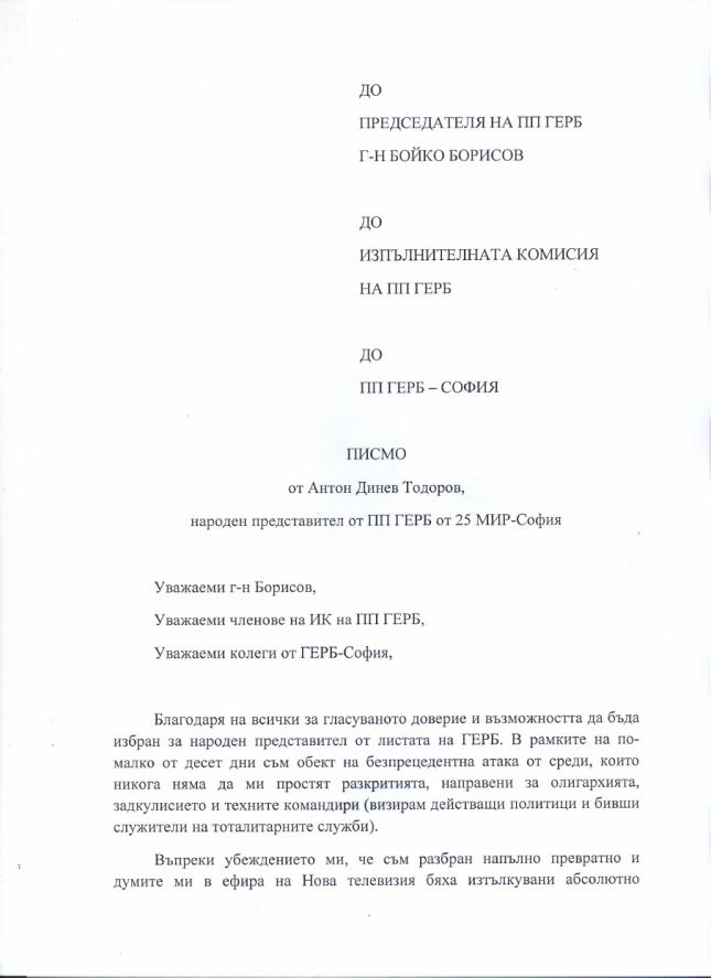 Тодоров е изпратил специално писмо до ръководството на партията, в което обявява решението си.