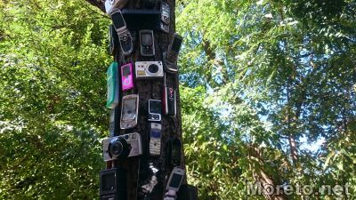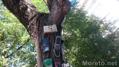 Непотребни телефонни устройства, както и стари фотоапарати, украсиха изсъхнало дърво на улица край „Чаталджа“, видя репортер на Moreto.net.