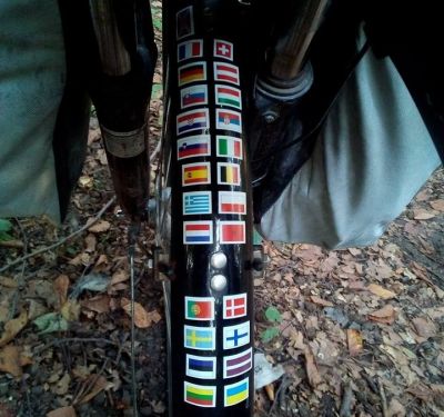 Дамиен лепи знаменца по гумата на велосипеда си, от държавите които е посетил.