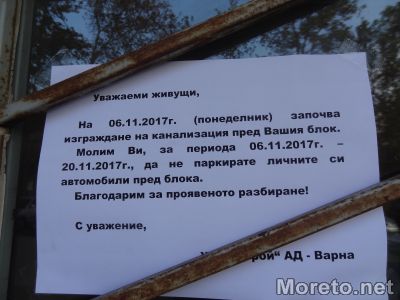 Заради строителството живеещите в близките входове са помолени от Общината да не паркират автомобилите си пред домовете си поне до 20 ноември.