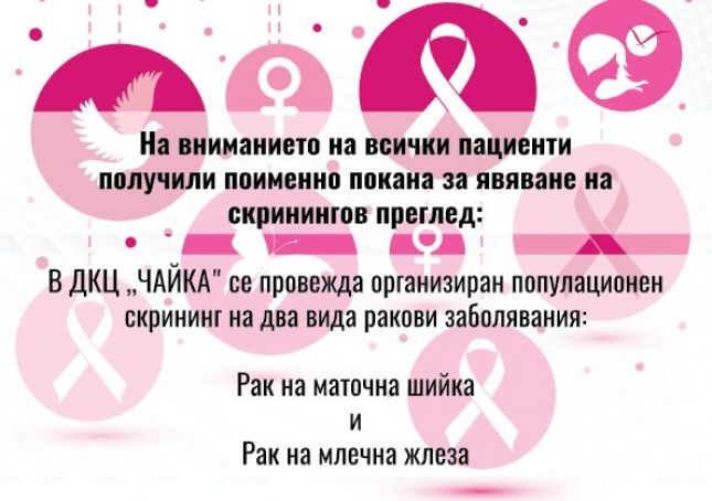 В ДКЦ "Чайка" - Варна се провежда организиран популационен скрининг на два вида ракови заболявания - рак на маточната шийка и рак на млечната жлеза, научи Moreto.net.