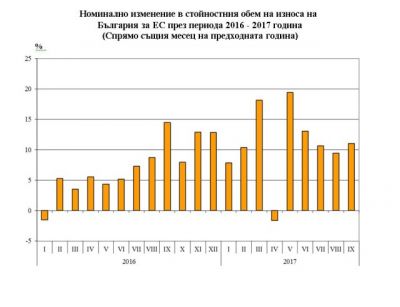 През периода януари - септември 2017 г. износът на страната ни е на стойност 25 542.8 млн. лева. Само за месец септември ръстът при износа ни за ЕС е нараснал с 11% и е в размер на 3 156.9 млн. лв.