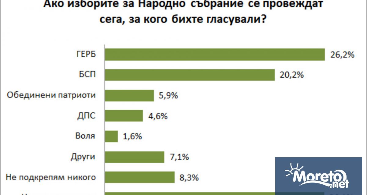 Ако изборите бяха днес, за ГЕРБ биха гласували 26,2%, за БСП, 20,2%, за ОП - 5,9%, за ДПС – 4,6%, Воля – 1,6%.