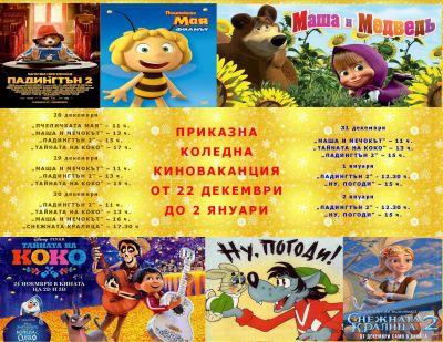 И тази седмица - от 28-ми декември до 2 януари - най-малките зрители ще могат да гледат любимите си филмчета. Прожекциите са в удобно за децата и родителите време и ще се проведат в зала Европа на Фестивален и конгресен център.