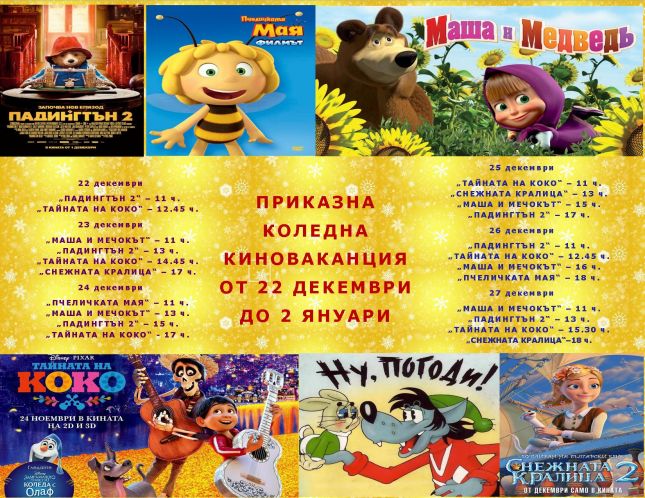Днес е последния ден, в който най-малките зрители ще могат да гледат любимите си филмчета в рамките на проекта "Колдена кино ваканция". Прожекциите са в удобно за децата и родителите време и ще се проведат в зала Европа на Фестивален и конгресен център.