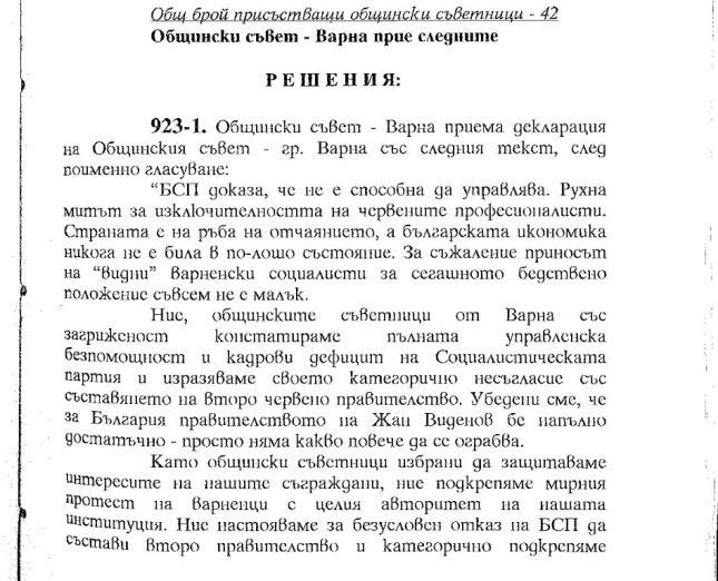 Варна също има своето участие в събитията. Освен ежедневните протести по улиците на морската столица, Общинският съвет в града приема специална декларация, която зове БСП да се откаже от втори управленски мандат в рамките на тогавашното Народно събрание.