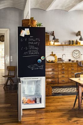 Естетическа наслада и комфорт дават индукционен плот с вграден аспиратор, стенния аспиратор Creative Slim с променящо цвета си интериорно осветление или комбинираният хладилник CoolCreative с врата от черно матово стъкло, на която се пише с тебешир.