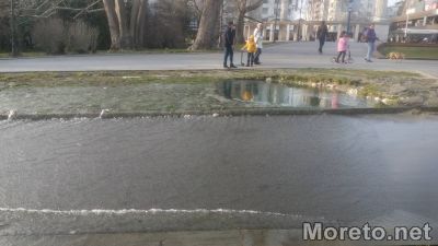 Гейзер от вода в района на слънчевия часовник на входа на Морската градина буквално залива алеята в посока "Аквариума".