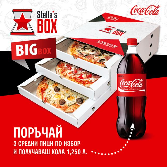 Кутията BIGBOX се предлага с три средни пици по ваш избор от менюто на Stella’s BOX или от готовите предложения в секцията на сайта: www.stellasbox.com/menu/boxes