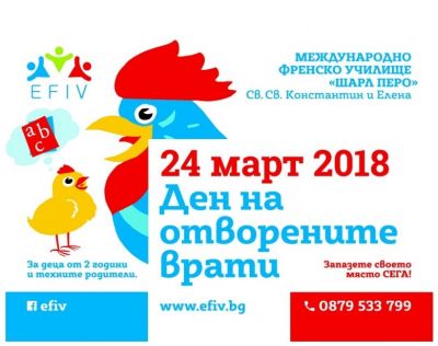 Искаме да поканим родителите, чиито деца в момента са във възраст 2-3 години и които търсят дългосрочна алтернатива за образованието им на нашия Ден на отворените врати. Да се запознаят отблизо с EFIV - да разгледат стаите, да се запознаят с учителите, с други родители. Нека не се колебаят да ни потърсят за събеседване, за да се запознаем с тях и детето им, да зададат всички въпроси и да получат в много подробни детайли информация за предимствата на френското училище.