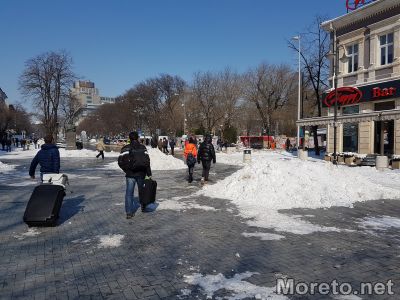 След вчерашната виелица и интензивен снеговалеж, днес на площадчето на "Севастопол" вече се виждат плочки. Снегът е изринат и натрупан на купчини. Същевременно работник с малко снегоринче минава в пространството между хотел "Черно море" и Входа на Морската градина.
