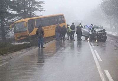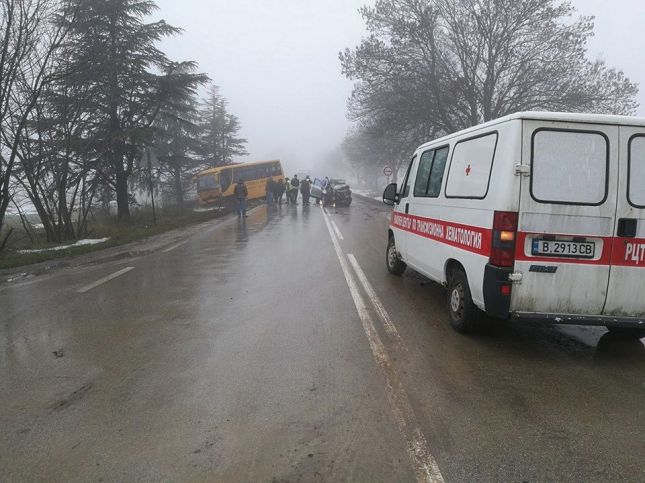 Джип „Шевролет” и училищен автобус са катастрофиралите автомобили в участъка между разклоните за селата Любен Каравелово и Зорница днес около 14.00 часа.