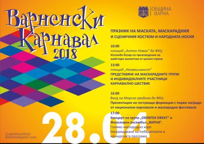 От днес – 12-ти март, до 17-ти април граждани и организации могат да подават документи за участие в четвъртото издание на възродения "Празник на маската, маскарадния и сценичния костюм и народната носия - Варненския карнавал", който тази година ще се проведе на 28-ми април. Организатори на събитието са дирекциите „Култура и духовно развитие“ и „Образование и младежки дейности“ към Община Варна.