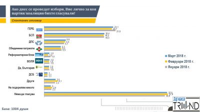 Изследване: Разликата в подкрепата за ГЕРБ и втория БСП се запазва през март