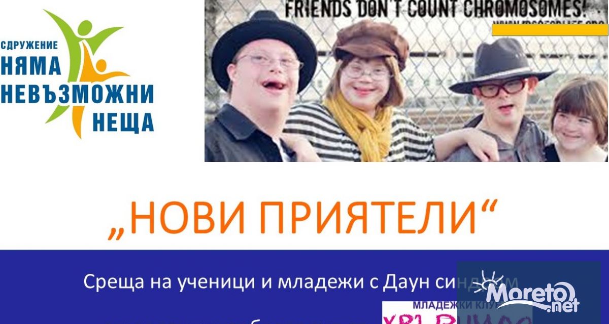 Сдружение „Няма невъзможни неща“ организира на 24 март, събота, от 14 до 16 часа, среща на ученици и младежи с Даун синдром под надслов „Нови приятели“, научи Moreto.net. Събитието ще се проведе в клуб "Хвърчило", на улица "Генерал Радко Димитриев" 7а (зад Рощок, между Централна поща и Стоматологията).