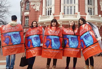 Младите актьорти носеха върху себе си своеобразни наметала с плакати на представленията във варненския театър.