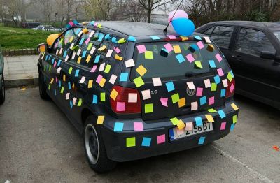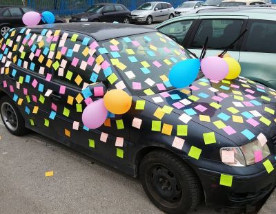 От написаното става ясно, че рожденичката става на 21 години. Освен с хартиените листчета автомобилът е отрупан и с балони, които кореспондират цветово с бележките в синьо, жълто и розово.